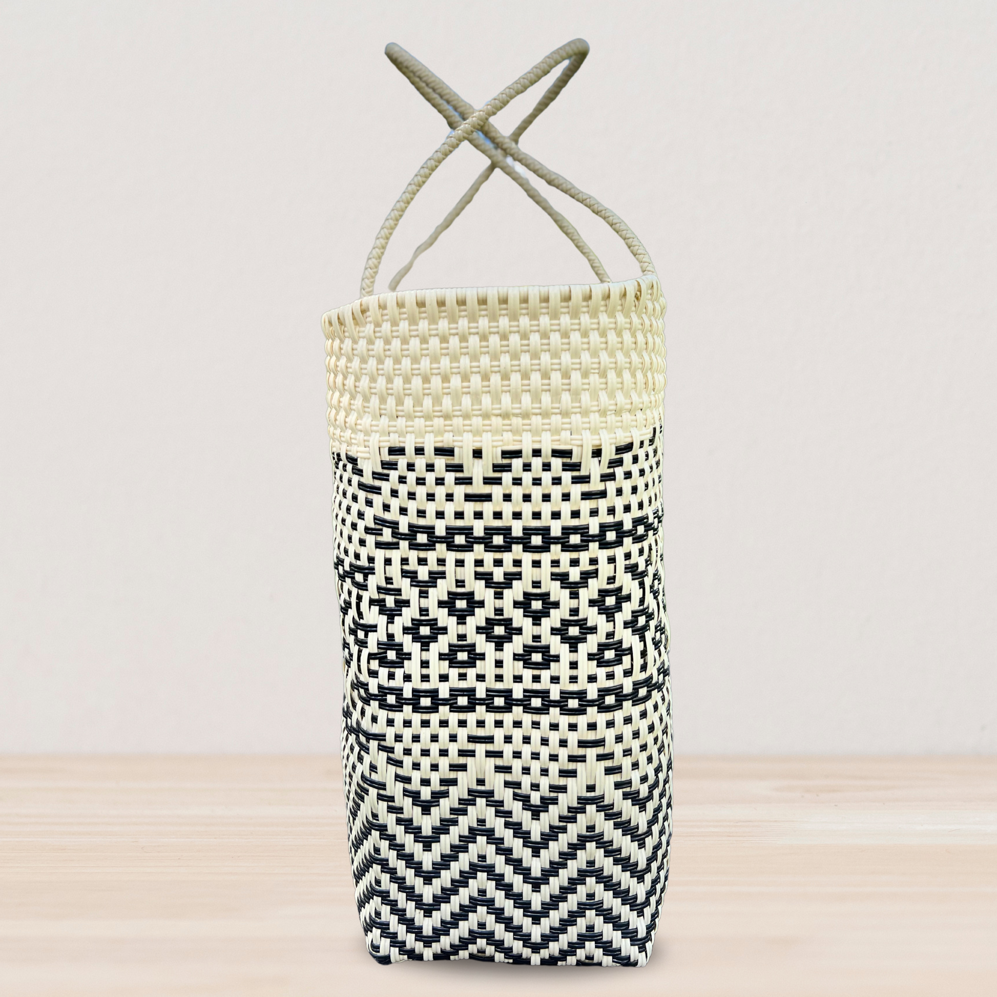 This handwoven Eco-friendly tote bag, crafted from recycled plastic, celebrates the rich artistry of Mexican craftsmanship. Its elegant black-and-white design adds timeless sophistication, making it the perfect accessory for any season. Whether you're heading out for a casual day, the office, the beach, or attending a special event, this classy tote offers generous space and a sturdy flat base for easy loading and stability. Appreciated for its exceptional quality and thoughtful craftsmanship, this tote isn’t just a bag—it’s a statement of style and purpose.